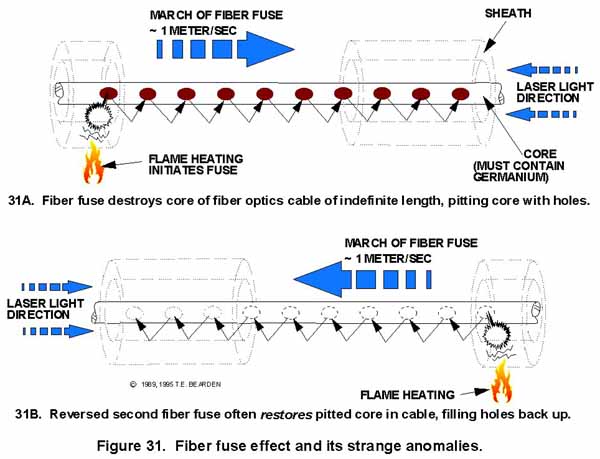 | The Fiber-Fuse Effect Transducing Time into Energy (Excerpted from "Matters Arising") After all that preceding background, we are now ready to return to arrays of semiconductors that use very sophisticated feedforward and feedback. We add one additional fact: Germanium has a unique characteristic. There is some transduction of transverse waves into surface longitudinal waves, and vice versa, in germanium. This means that germanium transistors or semiconductors can give — under the right circumstances — a little transduction between the net time-oscillation EM waves and ordinary transverse EM waves. In the transduction, "decompression" of a minuscule bit of time gives extra energy. As an example of the Germanium anomaly, note that the eerie fiber fuse effect in fiber optics cables occurs only in cables containing germanium cores, and not at all in those containing cores with silicon and without germanium. Possibly the leading researcher in the fiber fuse effect is Russell. Some references are cited for the reader interested in pursuing that phenomenon, which demonstrates both overunity and time-reversal aspects. Energy overall is still conserved, if we extend the present conservation law to include both "uncompressed" (transverse) EM wave energy and "compressed" (time-oscillatory) EM wave energy, in addition to the "compressed" mass-energy. It appears that germanium diodes and transistors — particularly in multiple arrays with sophisticated feedforward and feedback — can and do produce coherence in decompression of a bit of time-oscillating LWs into ordinary transverse energy-oscillating TWs. In short, using germanium semiconductors, under the right circumstances one can get "free" excess energy from the transduction of a minuscule fraction of time flow into energy flow. With multi-loop feedbacks and feedforwards, particularly lots of them, the individual germanium transistor may have multiple signals appearing upon it from many other transistors at once. Examine now those aspects of the transverse signals that "cancel" because of phase antiparallelism. Voila! The energies of the zeroing components exist and superpose, and the transistors also perform a little phase conjugation, adding phase conjugates. This means that elements of the time aspects in the "zero force field" stress oscillation wave are antiparallel. In short, now one begins to have pumping in the time domain. When that occurs, we have a stress energy oscillation and also a time-stress oscillation component. That actually turns part of antiphased, zero-vector-summing EM waves into a time-oscillating spacetime curvature wave — a special kind of gravitational wave as we explained above — where the energy density (stress) of ST is oscillating, and the degree of forceful opposition of the time axis components is oscillating. In short, we have "time stress" oscillations as well. That makes an oscillating scalar potential (in terms of 3-space) and also an oscillating time wave. In short, that makes the new kind of t-polarized EM waves.